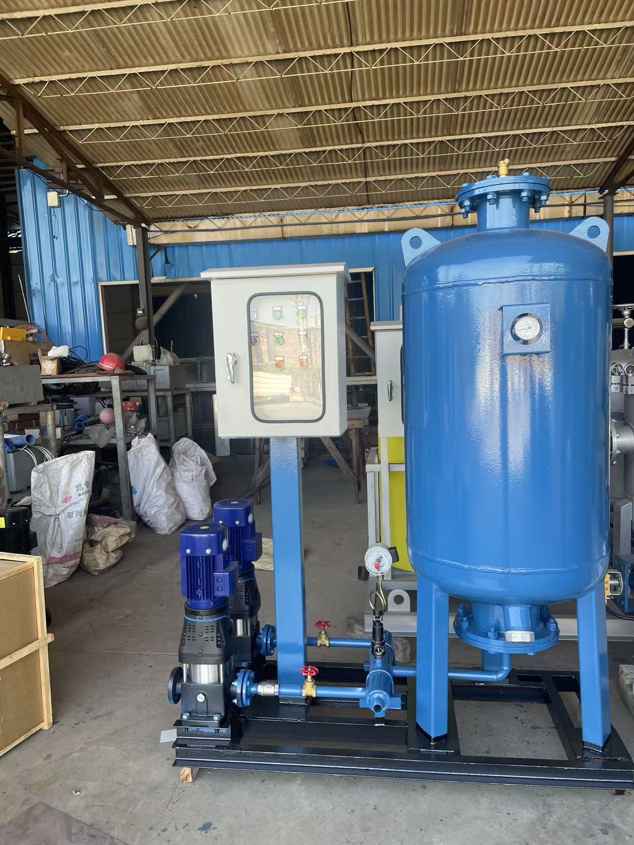 3. 冷缩补水:水温下降、水体积收缩→气囊膨胀,将水压回系统;若压力仍低于设定下限,控制柜启动补水泵补水至上限后停泵。